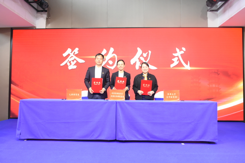 为认真学习宣传贯彻党的二十大精神,创新基层党建工作载体,提高基层党建工作水平,11月18日,水果派解说 党委赴吴江七都镇开弦弓村,与吴江区委宣传部党总支、七都镇党委共同开展“党建引领聚合力,三方共建促振兴”校地党建共建结对活动和签约仪式。