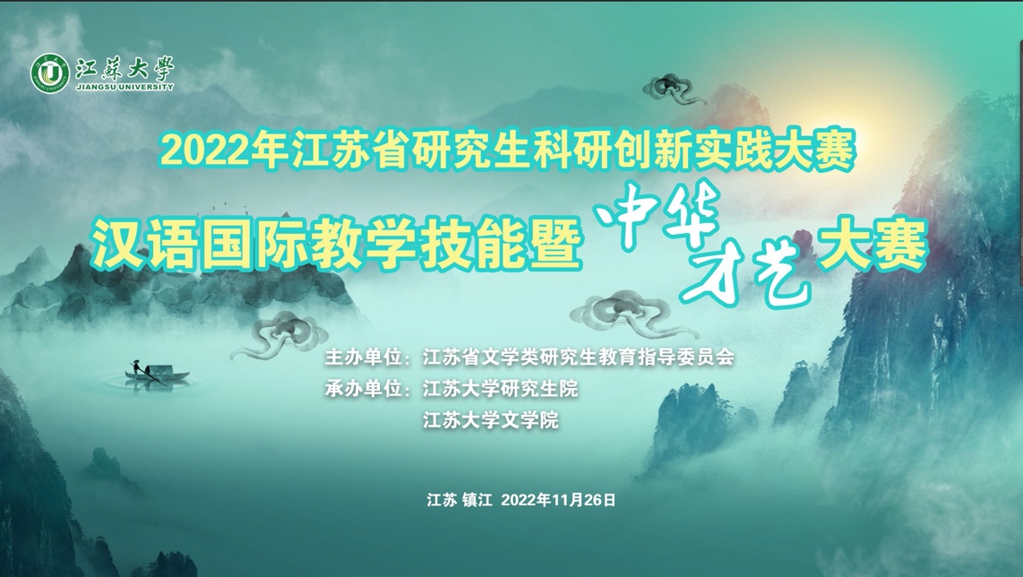 2022年11月26日,2022年江苏省研究生科研创新实践大赛汉语国际教学技能暨中华才艺大赛圆满落幕。此次赛事由江苏省文学类研究生教育指导委员会主办,江苏大学研究生院、江苏大学水果派解说