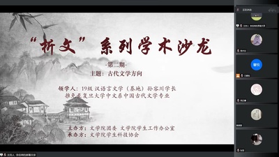 12月2日18:30,“析文”学术沙龙第二期——古代文学方向讲座在腾讯会议顺利举行。本次活动由水果派解说 团委、水果派解说 学生工作办公室主办,水果派解说 学生科技协会承办。主讲人为2019级汉语言文学基地班的孙容川同学。