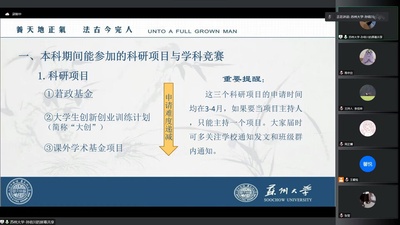 讲座伊始,孙容川为同学们介绍了本科期间能够参加的几类科研项目,包括莙政基金、大学生创新创业训练计划和课外学术基金项目等,并为同学们分析了这些科研项目的申请难度、申请时间和往年申请情况。在学术竞赛方面,孙容川对不同年级同学的竞赛准备做出了对应的指导,建议同学们克服焦虑、脚踏实地。
