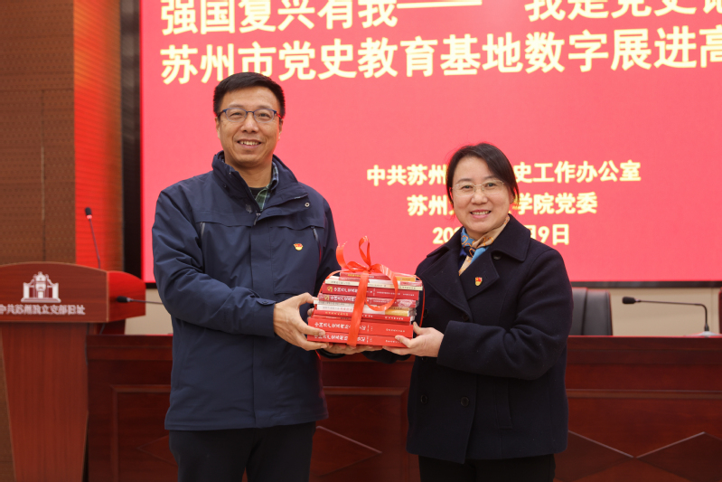 随后,中共苏州市委党史办副主任陈波代表苏州市委党史办向水果派解说 赠送党史系列书籍和苏州市党史教育基地数字展资料,宋清华书记作为代表接受赠与,并对党史办对此次活动的大力支持和捐赠书籍表示衷心的感谢,表示水果派解说 党委将充分利用好苏州市党史教育基地这个平台和党史学习资料,为学院学生成长注入“红色力量”,助力学生赓续红色基因,真正做到学有所悟、学有所获、学有所用。