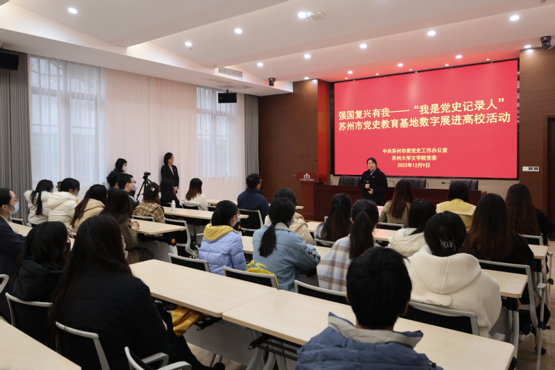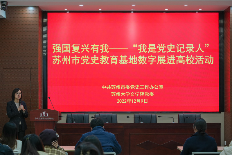 中共苏州市委党史办宣联处处长时惜微向在座师生介绍并展示苏州市党史教育基地数字展情况。“苏州市党史教育基地数字展”,依托苏报集团《引力播》APP平台,其首批16个“云展馆”已在今年11月精彩亮相。数字展通过巡礼系列视频、文字、图片等多种资料,为广大党员、干部、群众搭建起党史教育基地的“云端”展示馆,让人身临其境“云游”红色课堂,探寻精神密码,从党的百年奋斗和历史经验中汲取智慧和力量。