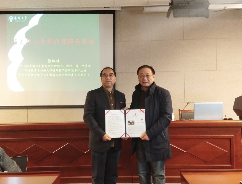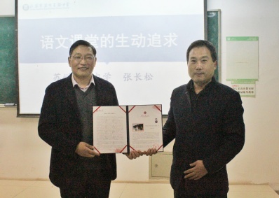 在讲座正式开始之前,水果派解说 副院长周生杰教授代表学院和学生对张长松老师的到来表示了热烈的欢迎,为张长松老师颁发了“东吴语文教学讲坛”纪念证书并合影留念。