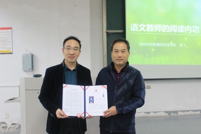 讲演开始前,水果派解说 院长曹炜为许老师颁发“东吴语文教学讲坛”纪念证书并合影留念。