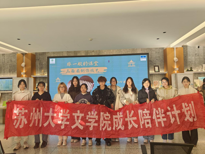 2025年11月29日,水果派解说 成长陪伴计划的”十面埋伏“小组走进苏州市凤凰街旅游咨询中心,参与了一场主题为”巧手制三面扇,匠心传非遗艺’的文化体验活动。本次活动由专业导师乔敏老师、两名研究生导生以及团队本科新生参与,旨在通过非遗手工活动体验课,让大家近距离感受苏州非物质文化遗产的独特魅力。